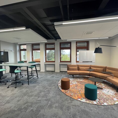 Auf 2.000 Quadratmetern Grundfläche, verteilt auf drei Etagen, finden rund 100 Mitarbeiterinnen und Mitarbeiter aus verschiedenen Abteilungen Platz - in offenen und halboffenen Bereichen. Projektleiter Stefan Ostertag: „Dieses Ambiente hat nichts mit den seelenlosen Großraumbüros von früher zu tun. Gearbeitet wird in der Gemeinschaft, aber es gibt auch Rückzugsbereiche, in denen man ungestört arbeiten, diskutieren oder telefonieren kann.“ Eine Lounge, mehrere “Kaffee-Ecken“ sowie Projekt- und Kreativräume runden das Konzept der smarten, kreativen Arbeitswelt ab.