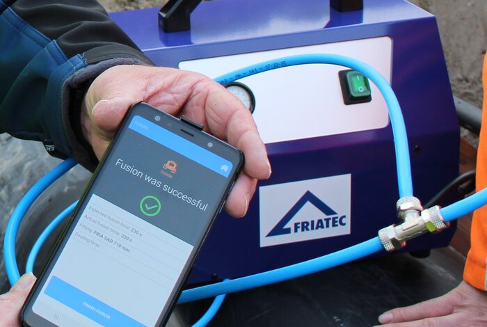 Nach der Rohrbearbeitung und Reinigung der Schweißflächen wird der Sattel ausgerichtet. Fürs Vorwärmen und Schweißen kommt das Schweißgerät FRIAMAT prime eco zum Einsatz. Die Dokumentation erfolgt einfach und praktisch über die FRIAMAT App. Nach der Abkühlzeit und der Druckprobe über Vakuum wird der Absperrschieber DN250 montiert. Das Anbohrequipment wurde hierfür vormontiert und an den Absperrschieber geflanscht. Der eigentliche Anbohrvorgang dauert max. 5 Minuten. Nach dem Anbohrvorgang wird die Leitung über das Anbohrgerät entlüftet, der Bohrer nach oben in den Flanschbereich gezogen und der Schieber geschlossen. Danach wird das Anbohrgerät demontiert. Die Kalotte steckt sicher im Bohrer.