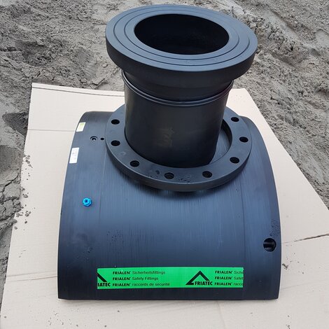 Die FRIALEN Stutzenschelle SA XL überzeugt in Verbindung mit dem neuen FRIAMAT prime eco. Die Anbohrung unter Druck erweist sich nicht nur als Problemlöser, sie ist auch eindeutig die wirtschaftlichste Methode, um nachträglich Abzweige zu erstellen. Für einen reibungslosen Ablauf sorgt die von Beginn an enge Absprache zwischen allen Beteiligten: Welches Equipment und welche Formteile sind nötig? Da die FRIALEN Stutzenschelle SA XL mit Flanschabgang in der Aliaxis Manufaktur in Mannheim vorgefertigt wurde, reduziert sich der Zeitaufwand auf der Baustelle deutlich. Die gesamte Maßnahme lässt sich binnen drei Stunden durchführen.