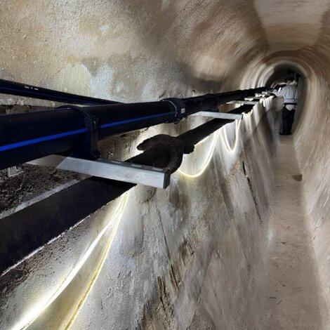The implementation was carried out in close cooperation among all project stakeholders. As part of the measures, the existing drinking water network was completely converted from cast iron to a polyethylene piping system. The renewal was carried out directly in the hospital’s walk-in energy canal, under difficult installation conditions and during ongoing operation.